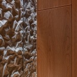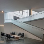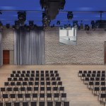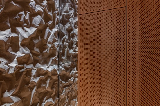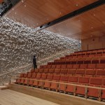 Inside the building, a newly developed crinkled concrete texture lines the walls of rehearsal and performance spaces, integrating acoustical qualities directly within the structural cast-in-place concrete walls.