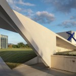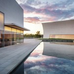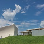 The titanium white board-formed concrete pavilions engage with the landscape, gently curving to catch natural light for the interior. The concrete finish is made up of 4” tongue and groove Douglas fir boards that lined CNC plywood forms. From a distance the concrete appears monolithic and seamless but when examined up close has the scale of wooden boards that relate to the body and hand, while simultaneously showing an imprint of the building process.