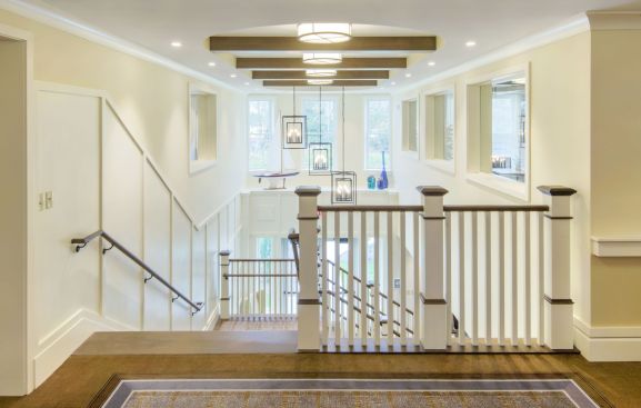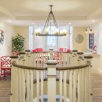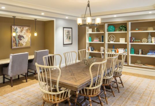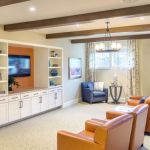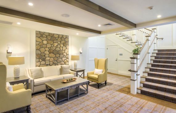 The building vernacular is a traditional New England aesthetic, stylistically in keeping with the coastal location and incorporates many details, such as wide overhanging eaves with decorative bracket supports, batten board, and clapboard articulation. The interior and exterior color schemes take cues from the location, incorporating hues reflective of its surroundings, with the use of ocean blues and various sand tones, accented with traditional white trim. Once inside, residents and visitors enjoy traditionally-styled spaces accented with warm tones and dark stained wood, with views into connected programmatic areas.