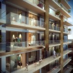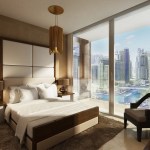 The client’s vision for the development was to provide spectacular views of the Marina for each apartment with well planned orientation and spatial layouts. Architecturally the development ‘grows’ from the ground. Aedas designed a solid base of stepped retails and villas with concrete and textured paint finishes, while the apartment towers above have a glass façade with a lightweight and transparent feel. The towers look clean and elegant in daytime, shaded with mesh fins that reflect the adjacent water, and transform into a lit sculpture at night, creating an iconic architecture on the most prominent site in Dubai Marina.