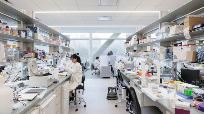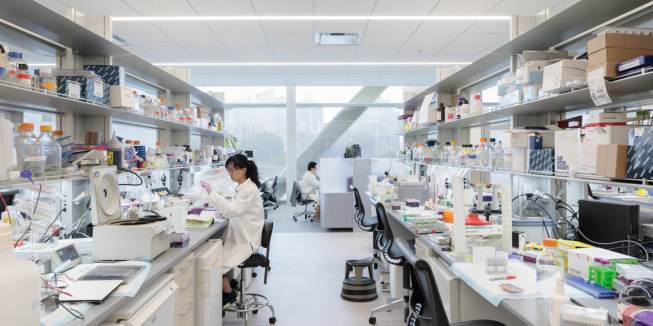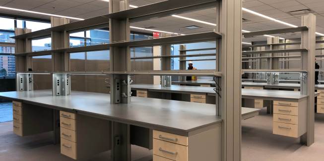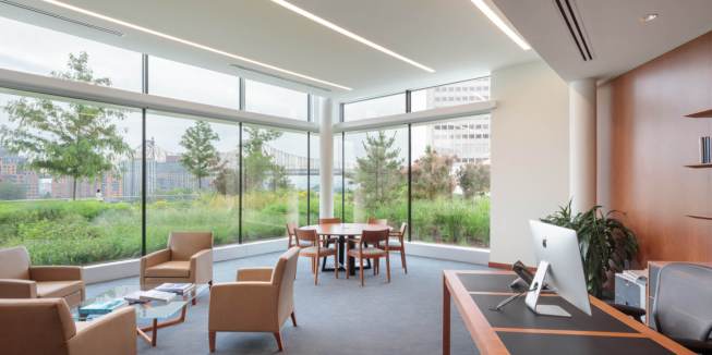 By placing the new laboratories and support space in a low-rise structure over the FDR Drive adjacent to the campus, the design extends the existing sloping topography of the campus further east, culminating in a green roof over the new laboratories that is integrated into the landscape, overlooking the East River. This design creates large floor plates extending in a north-south direction which not only serve current needs but also allow for the possibility of reconfiguration over time as needs change.