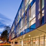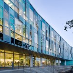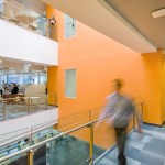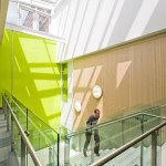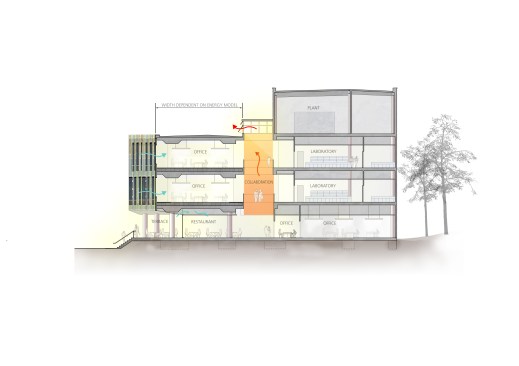 In a DNA-inspired design, an interactive atrium links the linear “strands,” one housing laboratories and a parallel one housing offices.