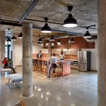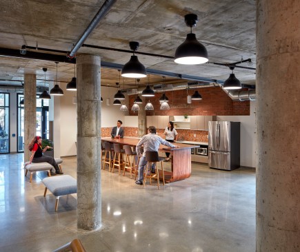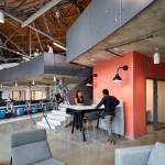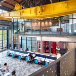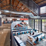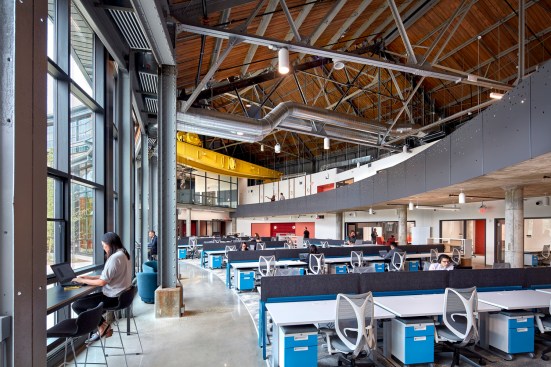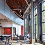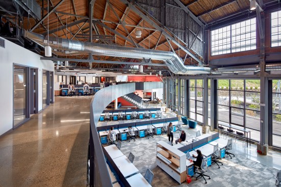 The addition of a partial second floor provides more office space (and a featured, glass-walled conference room) while also scaling the space down for its human inhabitants. At the same time, the removal of unnecessary walls and the replacement of its giant garage doors with windows enables occupants to appreciate the volume of this light-filled space.