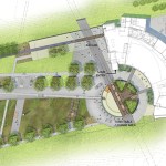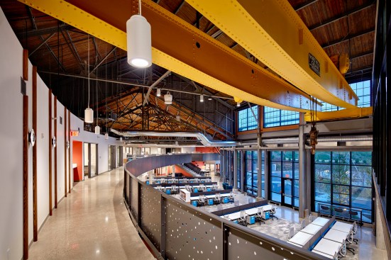 The giant windows where the garage doors once were also open views to outside, where a new public space uses native plants to integrate the site’s industrial remains—its turntable, the steel frame of an old shed—into the landscape of the Monongahela River.