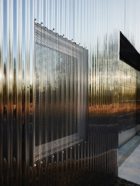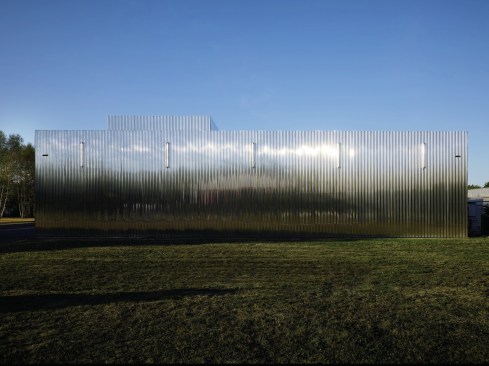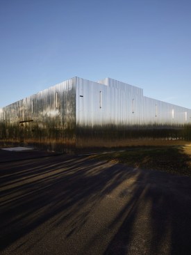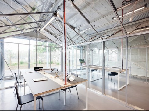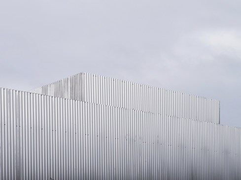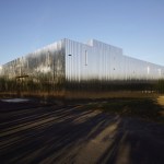 Open spaces are the result of the positioning of the boxes in the shed. Thus three open spaces form an area of offices and shared spaces, a zone of assembly and a zone for prototyping. While the majority of the windows and doors remain unchanged, new openings generate natural light. An emergence on the roof, that can be seen from the street, accommodates a 5 meters high photogoniometer used to calculate the light intensity. The whole building is covered with a double skin of corrugated stainless steel sheets. The alternation of solid and perforated sheets allows a transparency that lets punctually guess volumes in the background. This transparency also allows a qualitative highlighting of the facade that refers to the activity of Sammode itself. The surroundings of the existing building are also treated: the vegetation that has grown spontaneously provides a very pleasant work environment while an a landscape intervention has been realised inside the new patio. A terrace has been built as an extension of the facade with extra trees, hedges and grasses, for the comfort of the site occupants and their visitors.