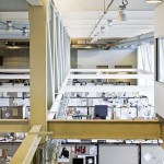 Predock has crafted an open, unified space, with studios and critique space organized around a three-story well. Balconies, stairs, and a bridge encourage what Predock calls “visual eavesdropping,” fostering social interaction and an environment in which students can learn from instructors and each other.