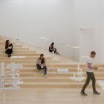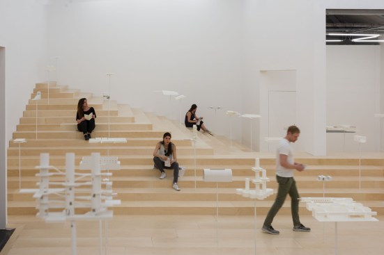 The pavilion is its own kind of learning “freespace.” By self-consciously adopting the architectural trope (or architectural cliché?) of the amphitheater, the space is constructed as a stepped landscape that enables individual study, small group informal conversation, and large group lectures and debates. The field of 3d printed models is displayed across this landscape, inviting visitors to move throughout the pavilion, and animate the models – almost as additional participants – during large lectures or events.
