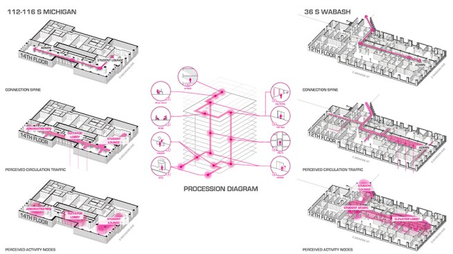 At 116 S. Michigan, the student affairs department which includes career services, was expanded by demolishing a wall to connect the 14th floors of two SAIC-owned adjacent buildings located at 112 S. Michigan Ave. and 116 S. Michigan Ave. A gradual incline was created to adjust for the elevation difference between the two buildings’ 14th floors. The extended space now has added student lounge seating and kiosks as well as two additional classrooms. The updated space boasts spectacular views of Grant Park, Millennium Park, and Lake Michigan.