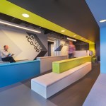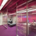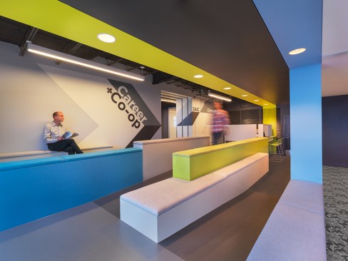 Prior to the renovation, the Sullivan Center at 36 S. Wabash had several corridors that closed off the space. Parts of the corridor walls were knocked down to open up the space starting at the 12th floor elevator bank. New translucent polycarbonate walls now allow better light and openness for the reception area while maintaining privacy for the offices. The registration center for the college has a completely transformed registration process due to the renovation. Color-coding directs students from one stage of the registration to the next and simplifies the wayfinding process. The space is donned in bright colors and artistic touches that embody the Art Institute brand.