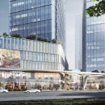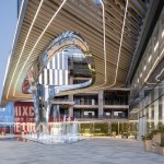 The sweeping form spirals into a loop and pulls visitors into the retail street. Two large office towers frame the edges of the retail street, and the canopy is used as a mechanism to create a comfortable pedestrian scale. The metallic skin is highly reflective to add vibrancy in both sunlight and the glow of early evening.