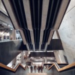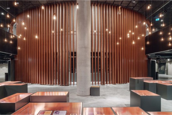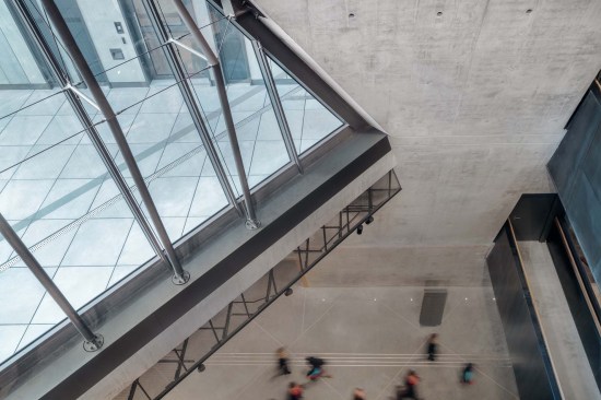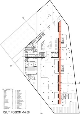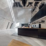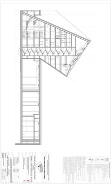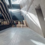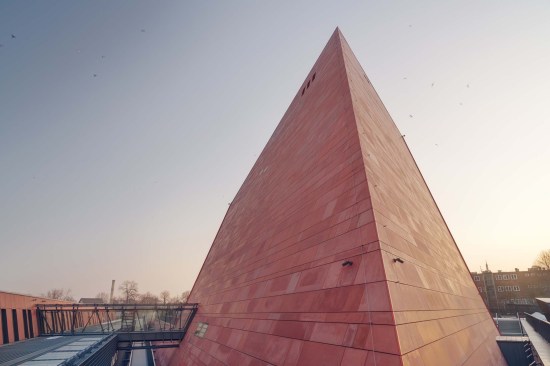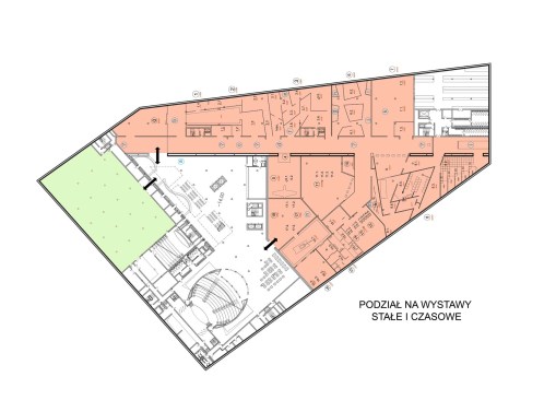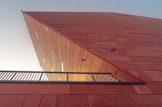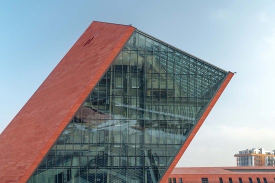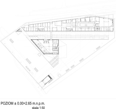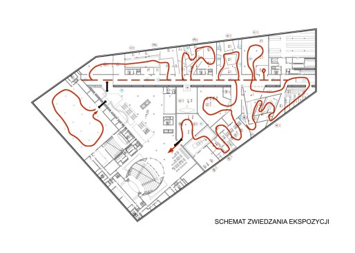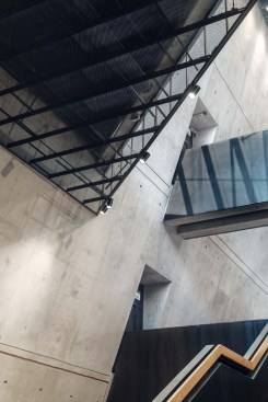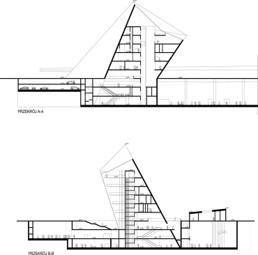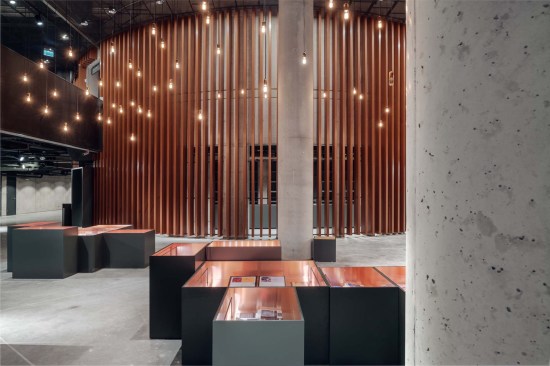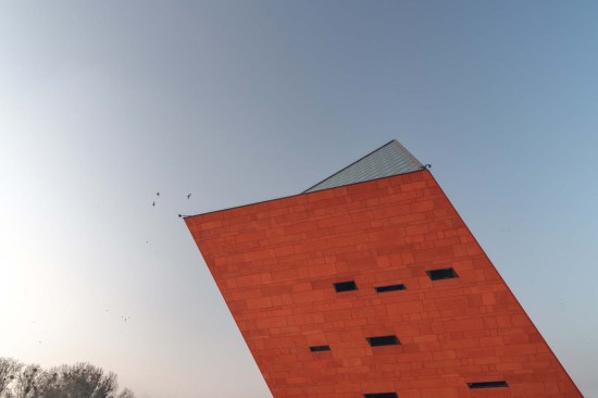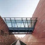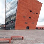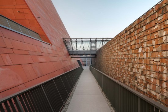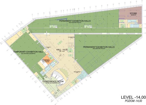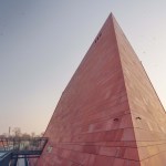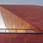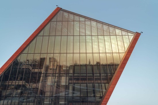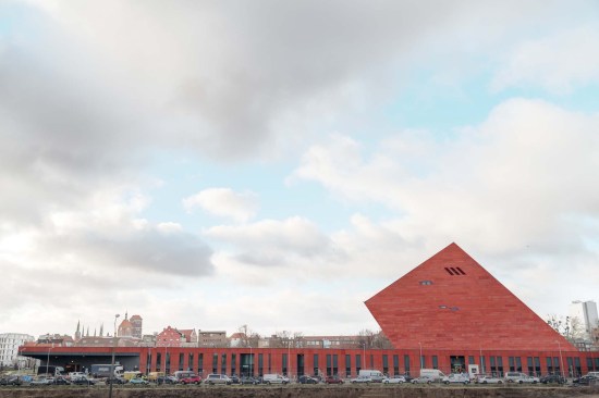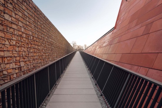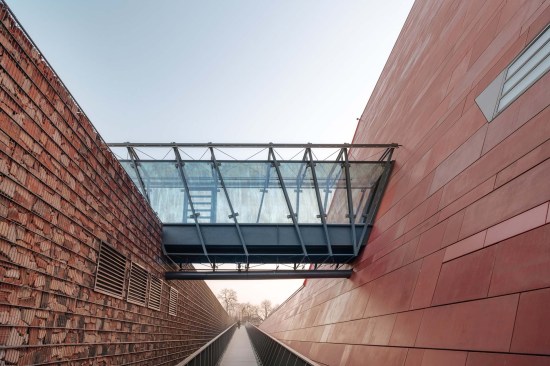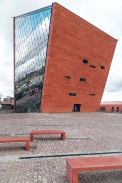 The building has about 23,000 square metres of floor area, of which the space reserved for the permanent exhibition covers around 5,000 square metres. This exhibition uses the most modern methods to present the Second World War from the perspective of big-power politics but, primarily, through the fates of ordinary people. It is not limited to the experiences of Poles, but recount those of other nations. Apart from the main exhibition space, 1,000 square metres are devoted to temporary shows. The museum’s mission is also to serve as a centre of education, culture and research. A paving stone found during the archaeological excavation, which had once been in the pavement of a street in the Wiadrownia district, was used as the foundation stone. It and the signed document were placed in the building’s stone base course. The rising, dynamic form symbolizes the museum below, while giving a panoramic and spectacular orientation to the historic city and its future. Echoing the iconic skyline of Gdańsk, with its shipyard cranes and church towers, the building ties together traditional urban spaces, scales, materials, and colours of the city with a 21st-century museum."