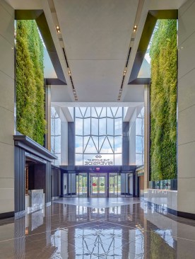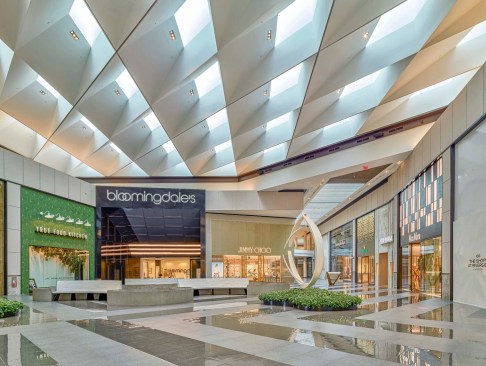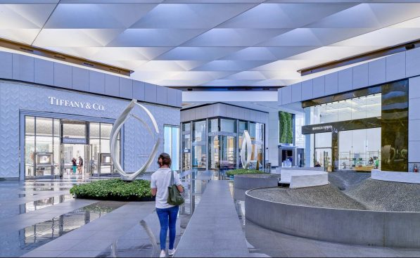 As guests walk through the Jewel Entrance, they are greeted by two, large living green walls, which were designed to emphasize the importance of wellness and provide a healthy green visual upon entry. In addition to these areas, a water feature is centered in the luxe court located in front of the Bloomingdale’s entrance, providing a calming visual as well as seating for shoppers to take in the magnificent architecture. Sprinkled throughout the court are art sculptures surrounded by plants as an extra layer of biophilic design. The organic shapes of the art pods and fountain provide a nice juxtaposition to the refined angles of the ceiling overhead.