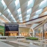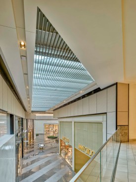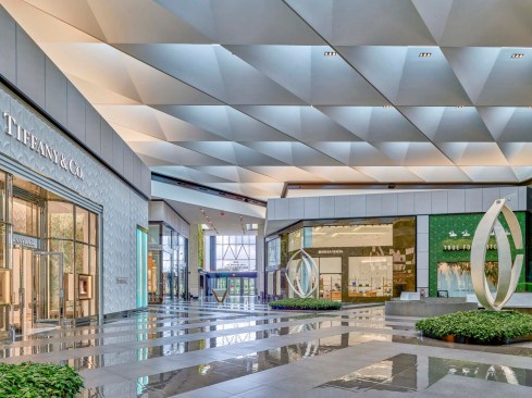 To fulfill the vision of museum-like opulence, the team specified a palette of white and neutrals on the walls, floors, and ceilings balanced with polished surfaces and mixed metals. Perhaps the most awe-inspiring part of the renovation is its feature ceiling with a modern, geometric architectural style. Located 35 feet above the floor, the ceiling features skylights that allow for natural daylight to shine all through the Luxe Court and provide a wow factor.