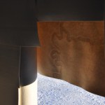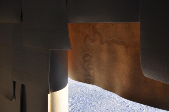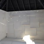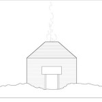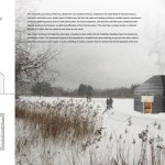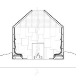 “The elemental, pure form of the hut, almost the very symbol of home, rendered in the stark black of charred wood, is nestled in soft white snow. Inside, layers of thick ivory felt line the walls and seating, creating a nest-like interior reminiscent of ancient gathering places strewn with animal pelts. On closer inspection, one discovers the felt layers embossed with delicate patterns and textures, a subtle sanctification of intimate space. The room has a unique sound, or absence thereof: it is silent, like the sound of new snow on the street.” – Aamodt Plumb Architects
