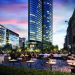 Bronze coloured metal detailing on the lower floors and bronze coloured feature fins on the pair of pavilion buildings either side of the tower complement the tan brickwork of the adjacent historic buildings around the dock basin. The dynamic façades and flowing interiors provide a refreshing and appealing contrast to the traditional tower and low-rise architecture of many buildings in Docklands.