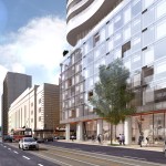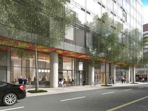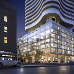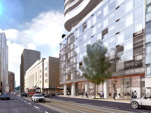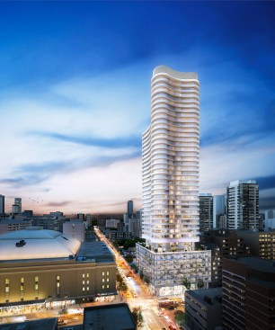 The intersection of Carlton Street and Church Street is hallowed ground for sports fans. Yet ironically this iconic status never precipitated any inflection of the city’s urban morphology. Hockey fans and concert goers spilled out of Maple Leaf Gardens onto narrow sidewalks. With neither a public square nor grand facade, this area typified Toronto’s matter of fact commercialism. Now, the proposal to build a mixed-use retail and residential building on the northeast corner of the intersection offers the opportunity to finally achieve landmark recognition for this historically important area of the city. 70-72 Carlton Street will be a unique 45-storey tower, its slender curvilinear tower and stepped top profile visible for miles. At its base, the new building will offer generous sidewalks by increasing the setbacks from property lines on the public streets. The sleek glassy base will offer big light-filled facades on the street, with a crisp cornice line at the seventh storey, recognizing and at the same time contrasting with the historic arena’s introverted opaque brick box that gave no quarter. Finally, the area’s grim matter of fact urbanism will be brightened by a modern exquisitely detailed architectural presence. The premium quality glazing system used in the base will feature seamless butt jointed glass forming a glistening smooth surface. The glass surface has been further accentuated by avoiding typical balcony projections common to residential units. Instead of balconies, the base of the project has large glass doors that slide open so that the ends of all of the units have access to the outdoors. Above the base, the tower is composed of curved surfaces that undulate in and out of the setback. Undulating surfaces include both the glass wall of the units as well as balcony guards at the edge of the concrete slabs. The tower and base of the building are separated by a two-storey reveal. Dramatically inset from the perimeter of the tower, this reveal has been designed so that the tower appears to float above the base. Inside this single storey space, there is an amenity facility offering residents a series of spaces as well as access to outdoor decks on the roof of the base. The proposed new building at 70-72 Carlton Street offers a generous ground level urban environment, well-considered retail and residential spaces and dramatic architectural presence. The unique curvilinear tower will be a landmark appropriate to the importance of its corner site. It is a fitting neighbor to the former Maple Leaf Gardens arena and a harbinger of the rebirth of this centrally located area of Toronto.