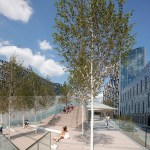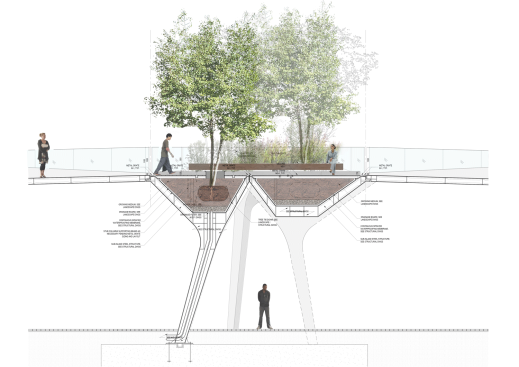 The Tide is conceived of as a series of elevated, landscaped islands where the public is invited to slow down, linger, and overlook the life of the Peninsula. Each island is distinct, defined by unique trees and planting, and by their surrounding views and sounds. These elevated gardens are designed as clusters of structural supports that create elevated planter beds, containing soil and channelling both gravity loads and water down to the ground. The sculptural structure supporting The Tide gardens above also frames and shelters the path below, creating arched pavilions that mark thresholds and passages at the ground level public realm.