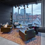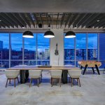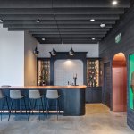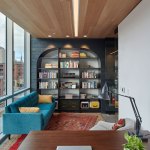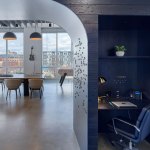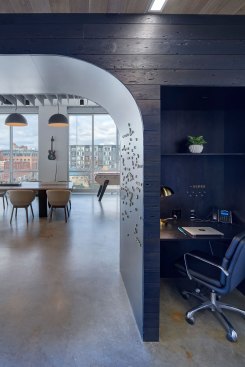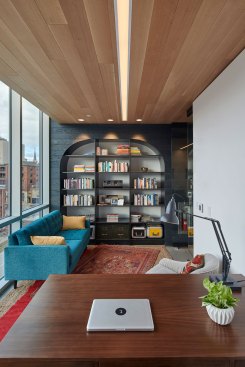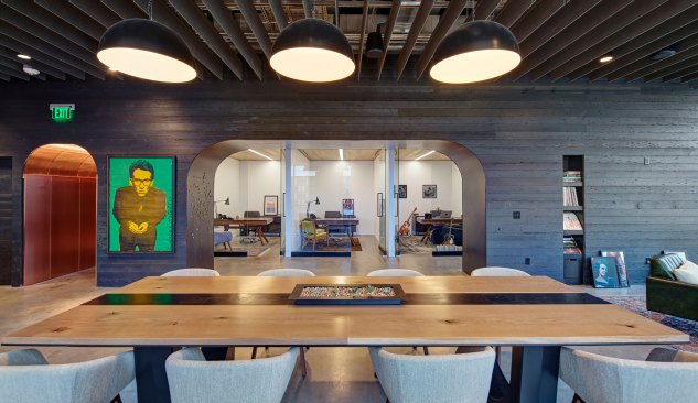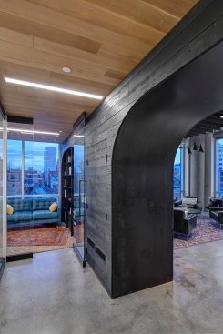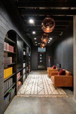 Visitors are greeted by a dark, cozy, library displaying books by authors the agency represents. The room sets a professional yet playful tone that is carried forward. A copper clad portal opens into a bright, multi-functional “living room” where the agency co-works, entertains, and records their video interview series. New and vintage furnishings and fixtures were carefully curated to coexist. An over-sized archway partially veils a collection of private offices, providing a sense of separation while maintaining flow throughout. The flavor-forward material palette includes copper, blackened steel, charred beetle-kill pine, and concrete with oak and felt ceilings. The resultant bricolage is a haven for inquisitive minds and lively conversations that result in global impact.