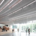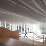We were drawn to a white finish for the interior, both for white’s association with the medical profession and as a way to foreground the natural setting. We wanted to catch the light with a design that fills the space and that engages with the human scale. The walls are cladded in white-painted curved plywood, and 0.8-millimeter-thick white powder-coated perforated aluminum panels are suspended from a structural frame on the ceiling. Light permeates the panels, drawing attention to changes over the course of the day. The metal volumes appear both white and solid, and both dark and transparent, filtering light together with the neighboring trees. The LED light tubes above the metal volumes negotiate with the natural light. As the sun sets, the lights glow more warmly, gradually intensifying and ultimately dominating the space.