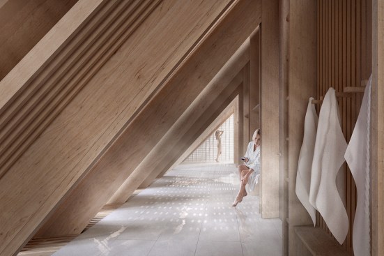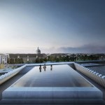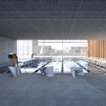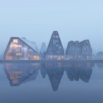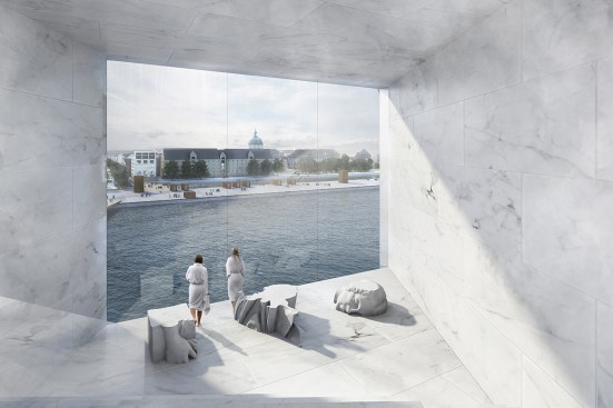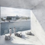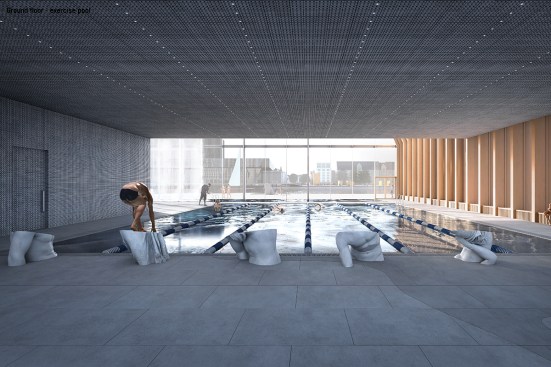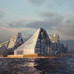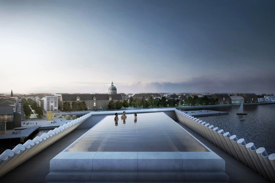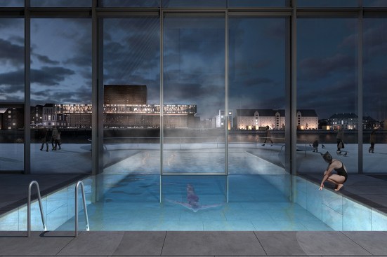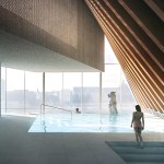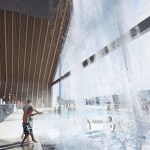 Copenhagen’s aquatic centre – The Waterfall – is part of the masterplan for Paper Island, also designed by COBE, and consists of one large public hall containing aquatic activities and facilities for clubs and associations, connected by a continuous cascading flow of waterfalls. Gathered under one roof, the auquatics center follows the distinctive roof motif on Paper Island with large sloping surfaces and gables oriented towards the waterfront. With a simple gesture of twisting the top, the aquatics centre adresses both the harbour and the inner courtyard on Paper Island, becomming a part of the informal, vivid public life on the island as well as placing it amongst some of the most important cultural institutions along the harbour front of Copenhagen.