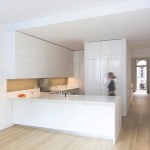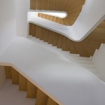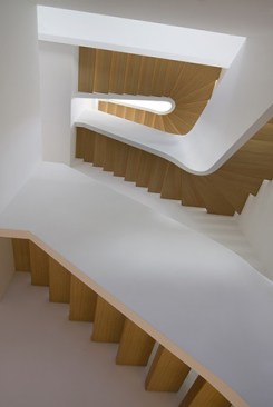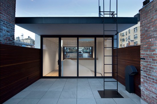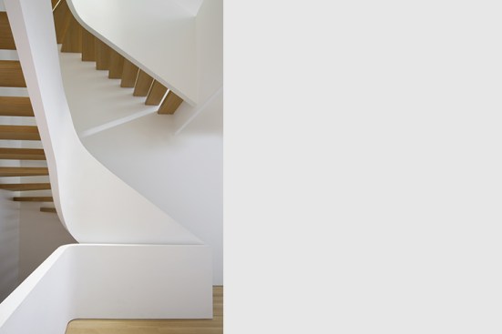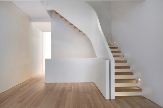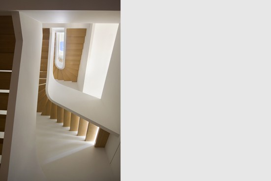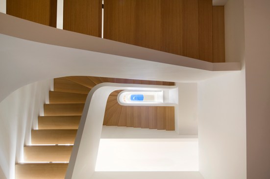 By conceptualizing the ‘grand stair’ as a ‘snake-like’ coil, we were able to open up the house vertically with a dynamic light well. At the top floor the coil of the stair is in a tight U-shape, providing maximum floor area for the private spaces. As the stair descends into the lower levels, where the most public spaces are located, the coil loosens, opening generously into its surroundings and allowing the most light through. The light filters down to the ground floor as it is reflected off of the smooth white curves of the handrail creating a modern sense of openness and fluidity and uniting all 5 floors. On the first two levels the fully glazed back facade opens seamlessly into the rear garden providing continuity between the interior and exterior and on the fifth floor a new addition accommodates a private entertainment lounge with uninterrupted view of both north and south Manhattan.