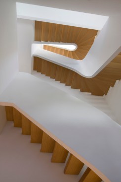 At the top floors the coil of the stair is in a tight U-shape, providing maximum floor area for the private spaces, where the bedrooms, bathrooms and study spaces are located.