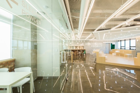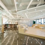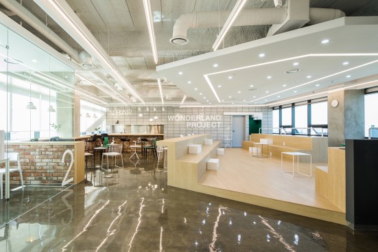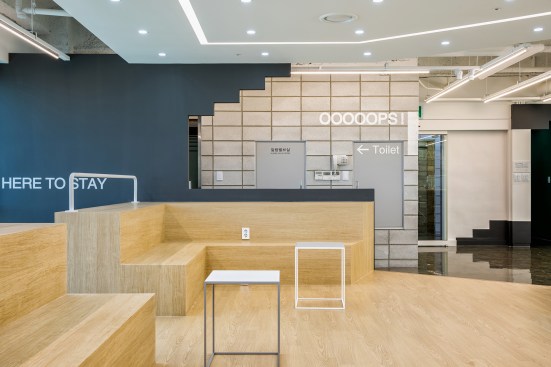 These days office interior trend is reflect working space serve free atmosphere like playground such as google headquarter office or apple office. However, not all office pursues creative thinking and free work style, so if they follow the trend hastily, it is easy to fail to make suitable work space. The project occupies a floor of a building where employees can relax and communicate with each other in a casual ambience. This company not pursue free work style, but they need rest space for efficiently working. Outside the elevator, the space changes from the rigid working environment on other floors to a completely different, comfortable space like wonder land.