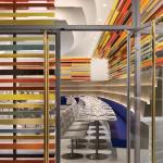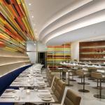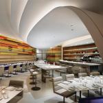 New York–based Andre Kikoski Architect’s design for this restaurant references Frank Lloyd Wright’s Guggenheim but also manages to stand apart as a striking contemporary space. The project features sculptural forms that create a flared ceiling, cascading walls that lead down to comfortable banquettes, and a curved bar and communal table.