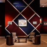 Postma sets a high value on the materials used, such as velvet in dark red and blue hues, and the visual coherence with the exhibited artworks. The geometric pattern of the walls repeats the hard-edge abstract rendering of the masterpiece.