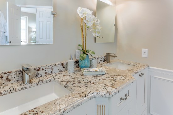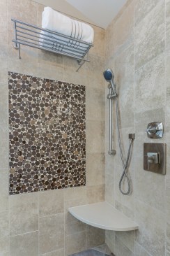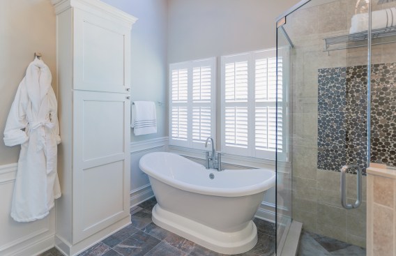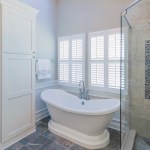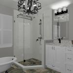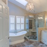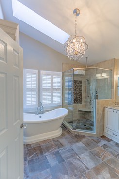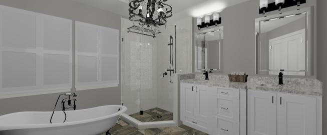 Clients desperately wanted an updated bathroom that offered a hotel feeling and more storage. Their current bathroom was outdated and offered little storage, the couple was literally growing out of their master bathroom. The work-scope was to design, gut, and remodel the bathroom. The couple mutually agreed to design the room in a Luxe fashion with a hint of masculinity. The first challenge was budget which did not allow for changing out the window to gain more wall space nor did it allow to extend into the master bedroom. The unusual octagon shape limited our space for anything to come to far out into the area where you entered from double doors. We designed to fit as much as we could neatly into the new space. For this we used a pantry style cabinet behind the door for linen closet. Being behind the door kept this matching linen closet out of site out of mind as to not take away from the beauty of the room with the doors opened. The vanity was easy to upgrade to make more storage as the old vanity was built lacking storage features and rather built with a makeup area feature. Since we were keeping the window in place to save on cost we could not make the shower too much bigger. What we did introduce was a freestanding tub. It offered the illusion of more room in the bathroom and gave us more room for the linen closet we added. The project created a very happy client. The transformation into a luxury bathroom was more than what they had hoped for and even joked they wanted to throw a party in their bathroom. We gave the couple so much storage that a few shelves and drawers were left empty once they moved back into the bathroom. The use of glass tiles strategically placed in the shower made a beautiful focal point through the open double doors. The chandelier hanging from the vaulted ceilings filled the space nicely as well. A bathroom they once hated to use is now a bathroom they do not want to leave. Out of date and out of room, that was how anyone would describe this master bath. The homeowners wanted an elegant bathroom that had lots of storage but didn't "look like a storage room." You can decorate a space with the materials you choose then bling them with your decor after the remodel. We went for the elegant move in look with lots of storage camouflaged into the cabinets. When you enter you are focused on the beautiful glass tile, unique luxe style chandelier, and the crafted vanity area. A bathroom you love to come home to.