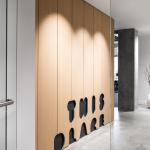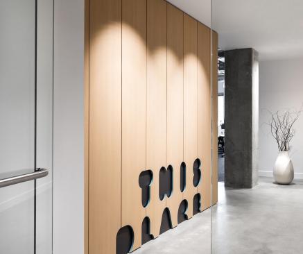 The informal entry with its rift cut white oak “This Place” branded wall offers visitors a moment to orient themselves to the space. Forgoing a formal reception desk for a subtler experience, the entry’s residential scale welcomes visitors and initiates a theme of self-guided discovery that continues inside.