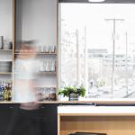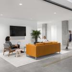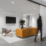 A central “living room” serves as an all-hands meeting space and features a 21-foot-long multi-paneled retractable wall that, when extended, creates a semi-private breakout space. With the door fully retracted, the “living room” connects to the kitchen and central social space, with screens and soft seating allowing it to transform for events and large gatherings. Throughout, a light-filled, minimal palette places emphasis on the creative work happening within, with pin-up and writable surfaces contributing to the agility and flexibility essential to This Place’s creative design work.