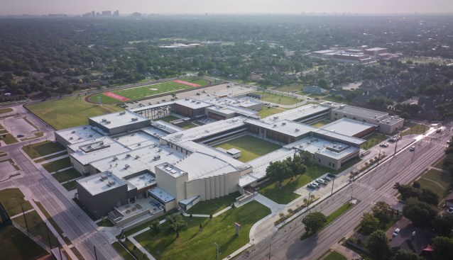 The addition includes a competition gym, cafeteria and kitchen, library, and spaces for the culinary arts and ROTC, as well as a band hall, dance studios, black box theatre, and extensive upgrades to the existing auditorium. The competition gym serves as the storm shelter, and Parkland Health and Hospital System operates a family clinic from inside the family/youth counseling center within the facility.