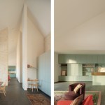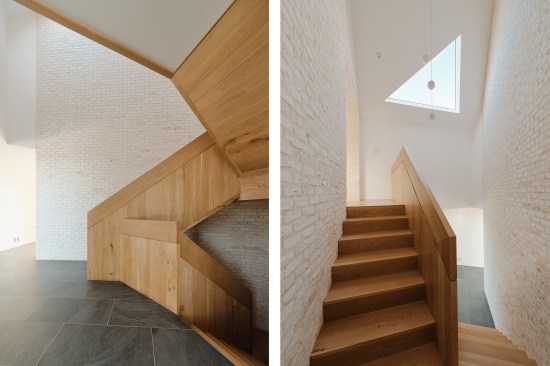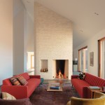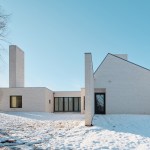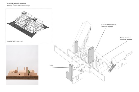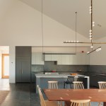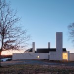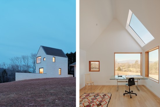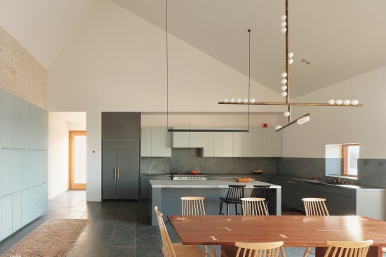 Refined yet cozy, urbane yet unpretentious, the Three Chimney House from T.W. Ryan Architecture is a reinterpretation of America’s rural vernacular that’s full of surprises. Located only a few miles from Thomas Jefferson’s Monticello, and perched on the lip of a steep slope, the house appears at first as a simple agglomeration of familiar forms, with its rough brick perimeter walls and pitched rooflines punctuated by a trio of chimneys. But upon closer inspection, anomalies begin to emerge: A recessed aperture is set into the wall, and once inside, a visitor discovers a vestibule with portal skylights. The interior unfolds as a composition of striking planar complexity that is vaguely pinwheel in shape, with the sleeping quarters, a guest lodge, and service elements all projecting outwards from the central axis of the main living space.