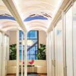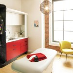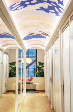 Exam rooms are located off of a narrow corridor lined in white ombré glass that goes from opaque at the bottom to clear at the top of the exam room doors. Opposite the exam rooms, the wall is opaque and mirrored. The graphic mirror in the lobby/reception area continues onto the ceiling of the hallway to draw visitors’ eyes upward. An ombré canvas curtain hangs behind each exam door, adding tiers of privacy and bringing color into the hallway. Exam rooms features a monolithic wood storage unit with rolling doors that contain medical supplies and a sink. The other half of the storage unit is an armoire for patients where they can find a robe, a place to hang clothes, socks, and a charging ledge, dignifying the exam process. The rooms feature the same custom black and white terrazzo that can be found in reception and in the kitchen niche.