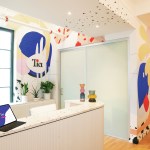 The Clinic’s lobby and entrance conveys convenience and clarity, signaling that Tia is frictionless, clear, and accessible and putting patients at ease. When patients arrive, they are greeted by a curved white, ribbed wood reception desk with a terrazzo surface. A graphic environmental mural covers the walls with speckled, amoebic shapes in pastels and grays.