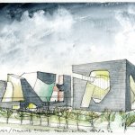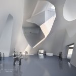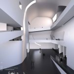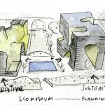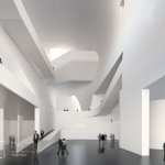 Both museums will be 20,000 m2 with a service zone connecting them below grade, bringing the total construction to 60,000 m2. A high speed tram running between these two museums connects to the the central business district of Eco-City.