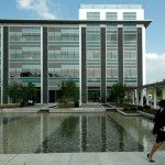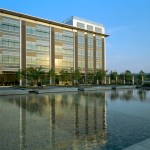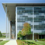 This corporate campus highlights the relationship between the built environment and its natural setting – a thirty-five acre tract of open-pasture, forest, and wetland. Three office buildings surround gardens and a parking structure. The space between the parking structure and buildings becomes a forecourt of gardens, water features, and walking paths. The staggered arrangement of buildings ensures open views from all offices. Their curtain walls combine different shades of spandrel glass to express a relationship with the surrounding landscape. The elevation that fronts the formal gardens features an ordered grid in contrast to the more playful, free-form pattern facing the natural wetlands. Stone piers underscore the related geometries of built form and open space.