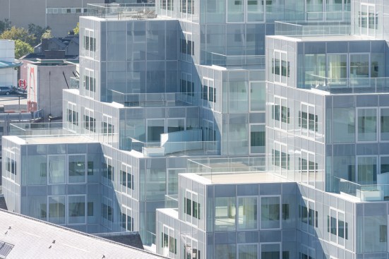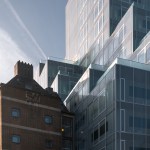 For Rotterdam's Timmerhuis, a new building for the city hall that accommodates municipal services, offices, and residential units, OMA conceived a modular building with repeated units gradually set back from the street as they rise into two irregular peaks. The building's composition of smaller cells creates an impressive, complex form when viewed from Coolsingel, one of Rotterdam's main arteries, and allows for subtlety and adaptability as the new building meets the Stadstimmerhuis (a municipal building, from 1953), which surrounds it on two sides.
