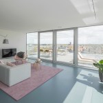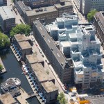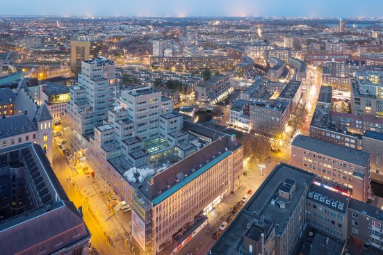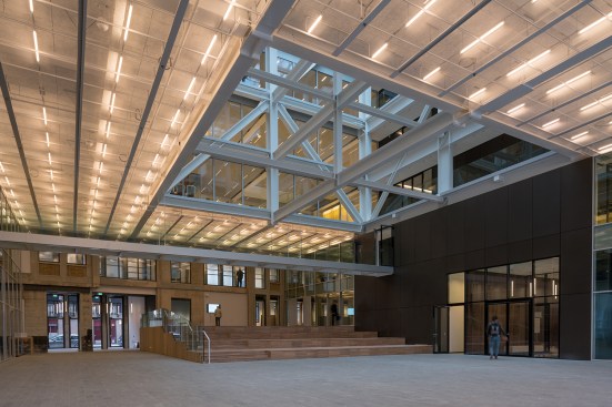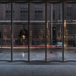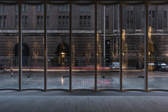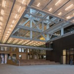 The cantilevering steel structure allows the uninterrupted unfolding of public space on the ground floor, home to a large public passage and the new location for the Museum Rotterdam.