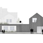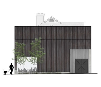 One of the challenges set forth by the client was to address the suffering edge condition along Main Street. The north elevation of the existing house faces onto Main and due to its deep setbacks, covered porch and raised entry, the building lacked the allure of a commercial frontage. The client’s vision was to create a hybrid project in which the second level would remain residential, the main level would become retail, and the back would be developed as additional commercial spaces. Whitewashing the existing house subdues the second level, allowing it to recede visually. The addition extends to the setback and is enveloped with expansive glazing to establish a strong retail presence.