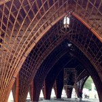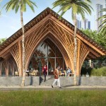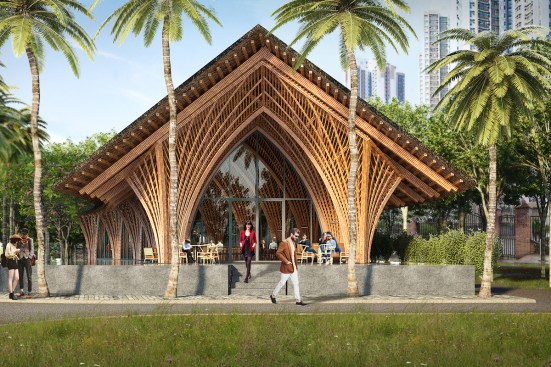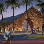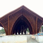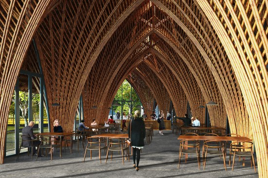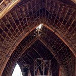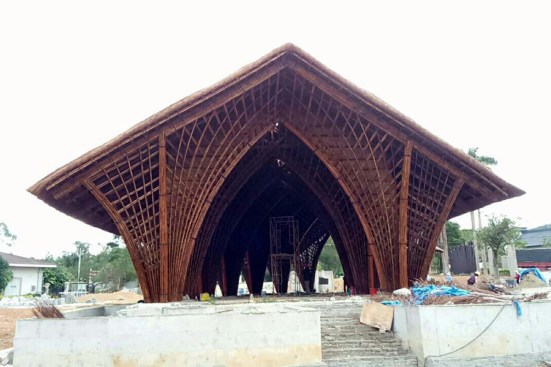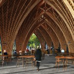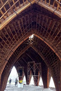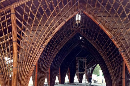 The fourteen columns give form to the bamboo building as they dynamically fan out in four directions from their base and as a result become impressively thick, forming a void inside.