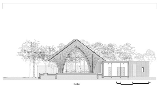 Since the interior space is required to be air-conditioned, a major challenge was keeping the inherently permeable bamboo structure airtight. The architects solved this by installing arch-shaped glass panels between the columns and the walls. Also, partition walls composed of bamboo layers, rubber sheets, and a thatch finishing were placed within the columns to make them airtight as well.