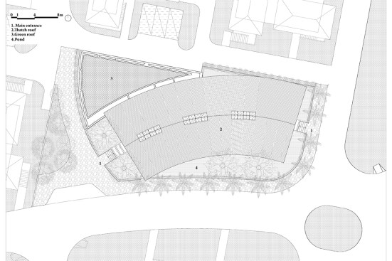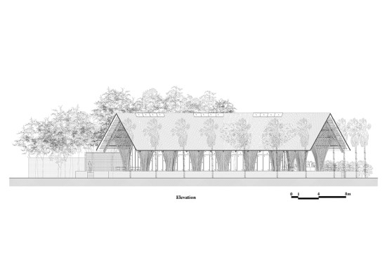 The spatial structure is quite simple and consists of two main components: the first being a bamboo building and the second being a back of house. The bamboo building contains 14 columns with an 8m span between them and is 14m in length from the edge of the eaves on one side to the other. The back of house contains the service functions such as WC, kitchen, staff room and storage. All of these programs are contained within a shallow pond that surrounds the building.