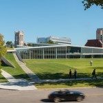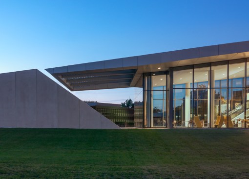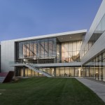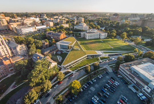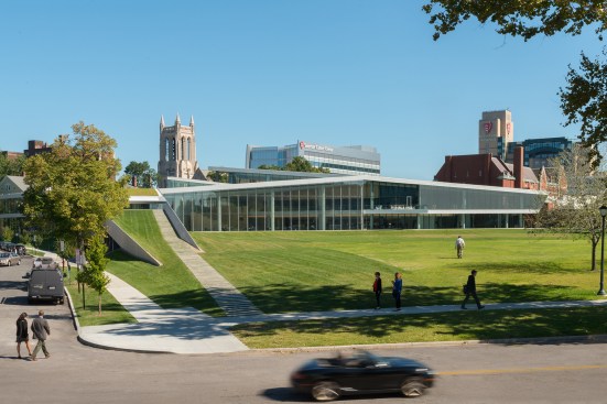 Linking three districts of the Case Western Reserve University campus, this low-slung student center captures the energy of its community with long arms that reach out to passersby and green roofs that visually merge it with the landscape. The building’s angular plan responds to, and wends between, two outdoor spaces: a soccer field covering below-grade parking that could not bear added weight, and an existing sculpture garden containing several pieces by Cleveland-born architect Philip Johnson.