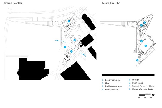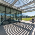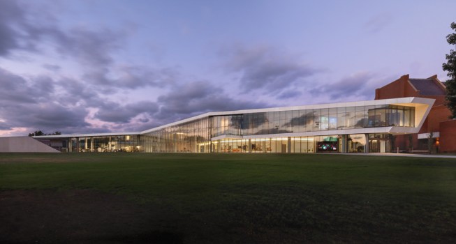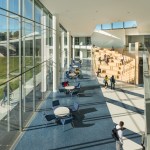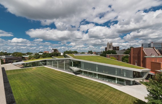 The building is also energy efficient: a west-facing, ventilated, double-glazed wall allows views while lowering heat gain, and the green roofs insulate and reduce heat-island effects. This student center is not just on the campus, it is of the campus—it is impossible to tell where the building ends and the campus begins.