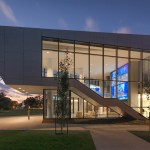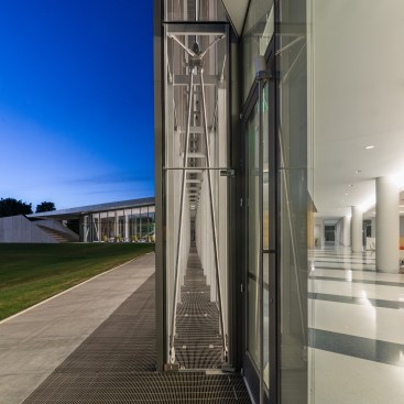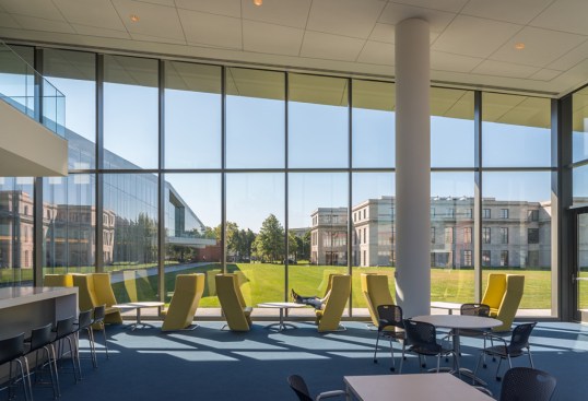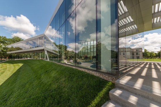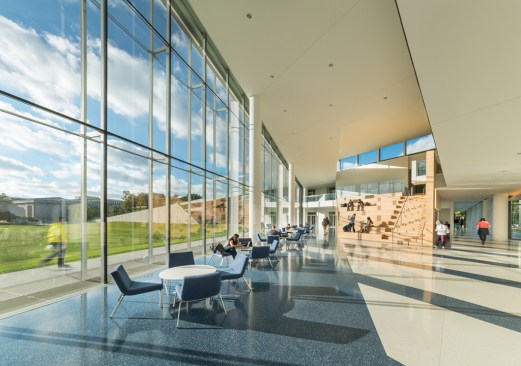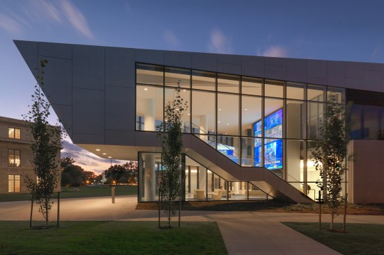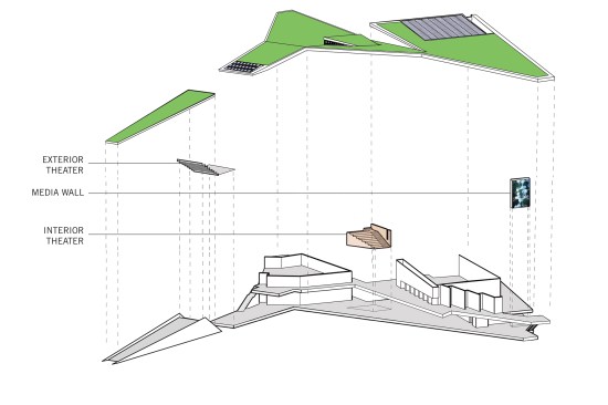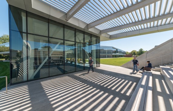 The building follows the flow of pedestrian circulation: A grass ramp stretches toward the nearby art museum and culminates in an outdoor amphitheater, and two-story triangular wings extend toward the engineering and science buildings and toward the liberal arts and professional schools, respectively. A second-story terrace and outdoor stair overlook the quieter sculpture garden.