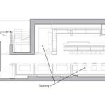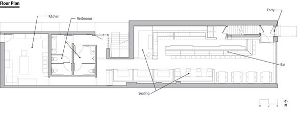 Controlling sound became a prime consideration in developing the details that give Tiny its particular ambiance. Lynch typically favors a spare, modern aesthetic that generates warmth through thoughtful material selections. Wood is a particular favorite, and the need for sound diffusion throughout the space led him to develop a randomly stacked pattern of light Baltic birch plywood with exposed edges. Cherry panels provide contrast and help to define the space. Tiny’s front façade is glazed to capture as much daylight as possible during the early hours of the evening, when the more sedate professionals form the clientele.