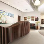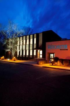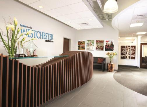Since there’s a limited amount of natural lighting inside the building, the architect chose light-colored walls contrasted with dark flooring to give a more open feel. Keeping the palette of slightly muted finishes with beige tones for a sophisticated look, while contrasting with the dark tones of the floor covering, it nicely sets off the Westchester Magazine branding, including magazine covers displayed on the walls.