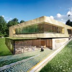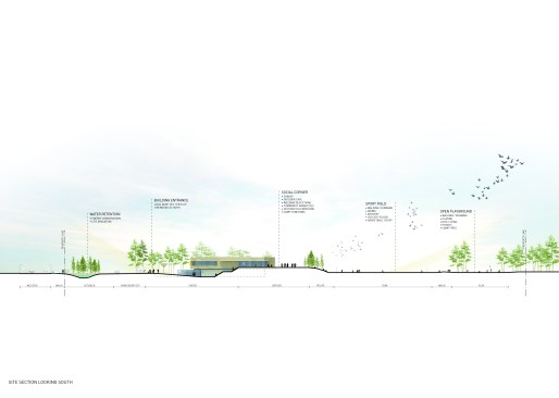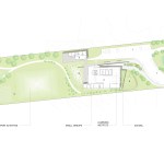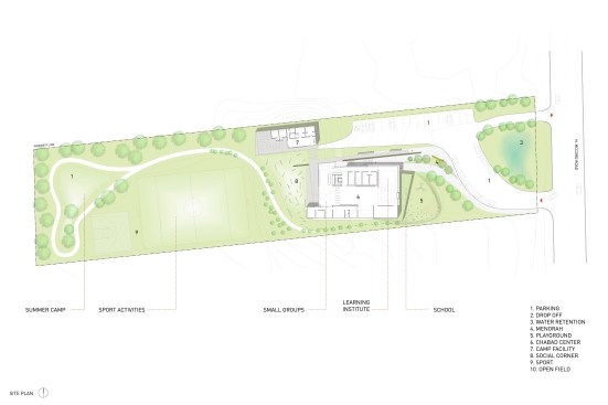 The design approach for the Chabad House of Toledo and its multitude of programs starts with a strategic site organization, and the integration of existing typography within the building’s scheme. As a result of this site specific strategy, the main building volume is placed at the highest point on this long narrow site, centrally located from front to back. The building becomes a threshold between the outward public zone and a more secluded, private area beyond. In order to respect the low profile of the surrounding residential neighborhood, the educational program of the complex is nestled partially below grade and screened with native vegetation. As a result of this move the overall structure appears as one story volume from the main pedestrian street.